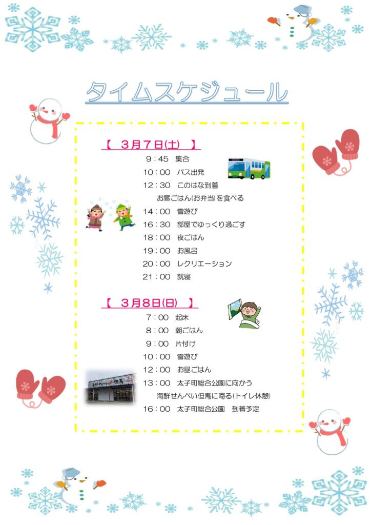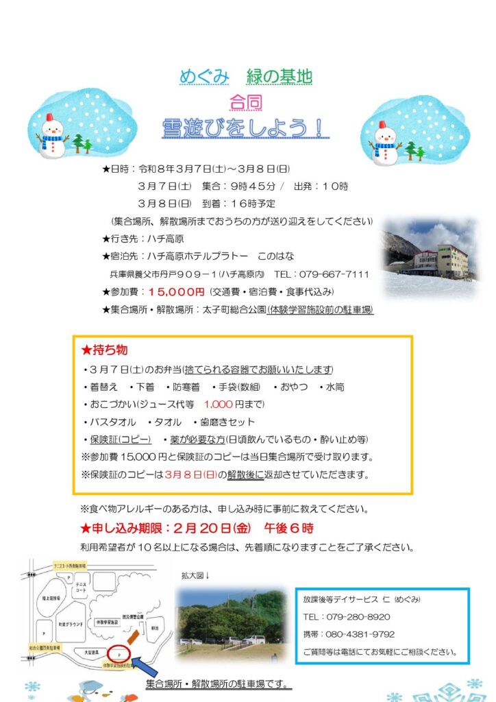特別プログラム 3月は、お泊り雪遊び! みなさん、参加してくださいね。 就労支援B型の利用者さんと一緒に楽しみますよ。 来年の1月は、パルナソスホールの朝のハーモニーの鑑賞と ガストでランチで始まります。朝の開所時間が、午前9時~ 少し早いです。